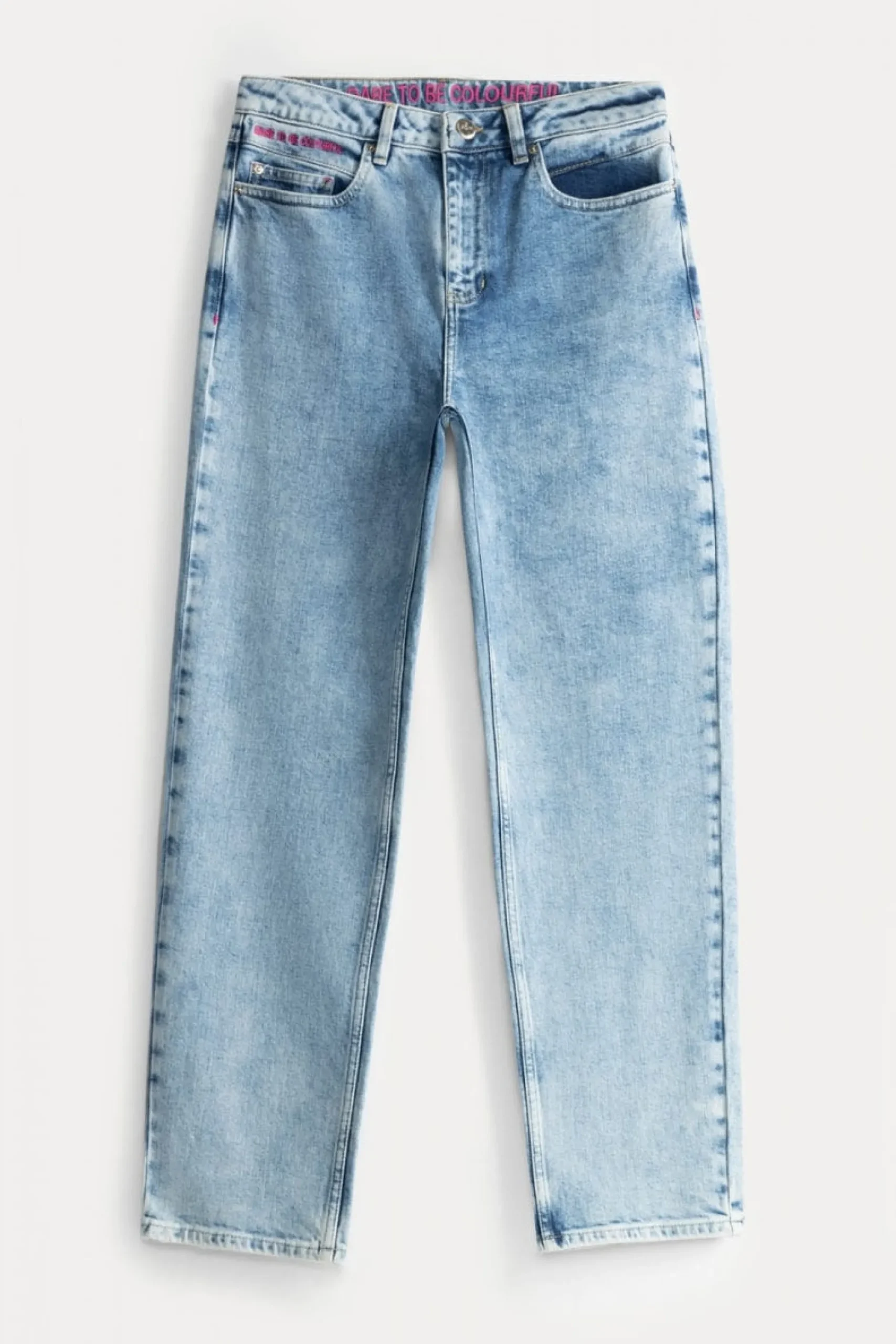 De broek heeft een recht model en een hoge taille. De broek heeft een binnenbeenlengte van 70 cm.