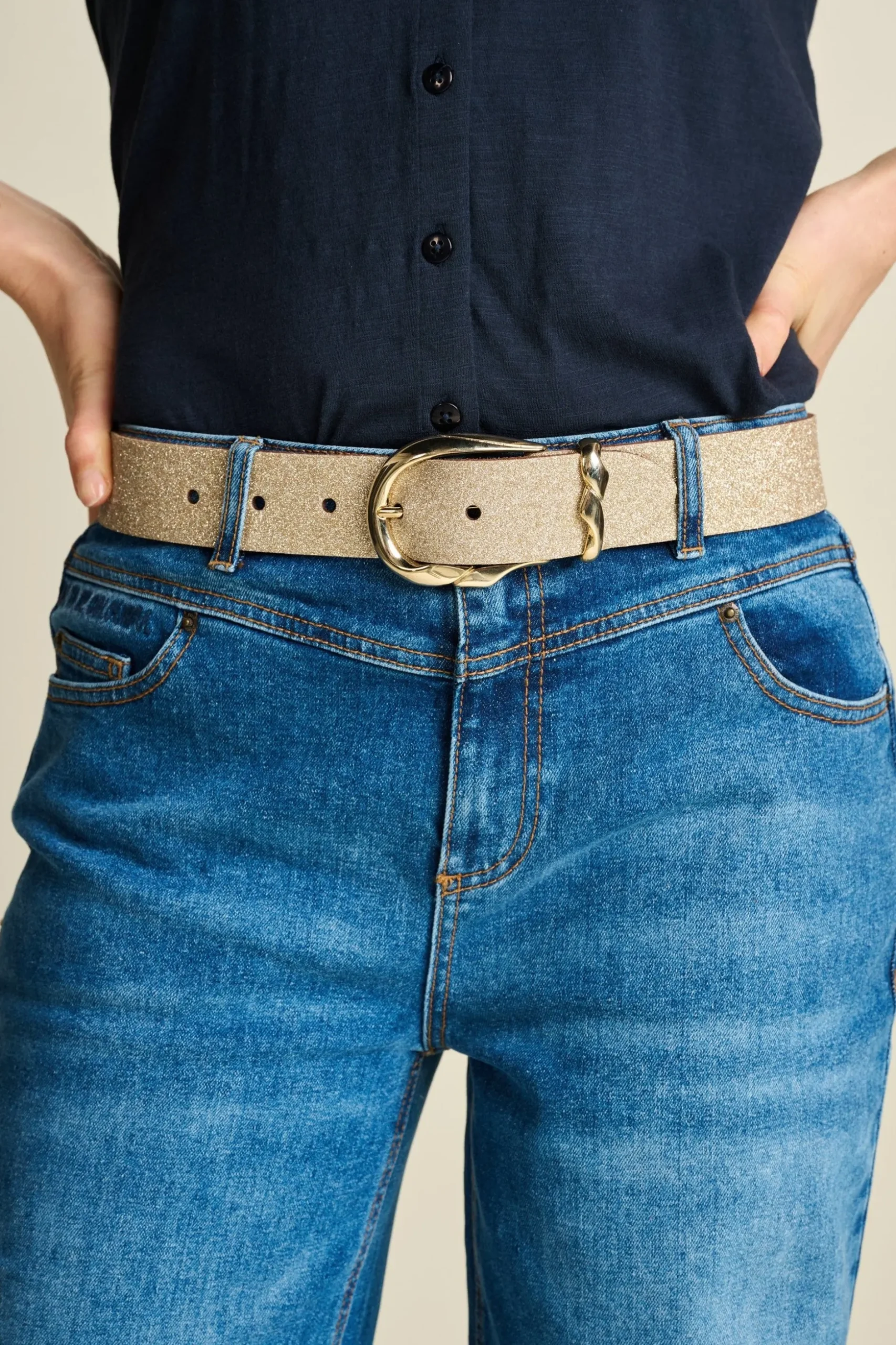 Riem Stardust Gold geeft jouw outfit de finishing touch. De gouden glitter riem heeft een unieke glanzende gouden gesp. Stardust Gold is ‘more sustainable’ door het duurzame leer afkomstig uit Nederland. Draag deze riem op een van onze Festive jurken voor een goede finishing touch. Liever een stoere look? Combineer de riem dan met een van onze jeans. Pasvorm: De riem is 4 cm breed. De riem is verkrijgbaar in 3 lengtes: 75 cm (maat 34/36), 85 cm (maat 38/40) en 95 cm (maat 42/44). De lengte van de riem wordt gemeten tot het middelste gaatje.