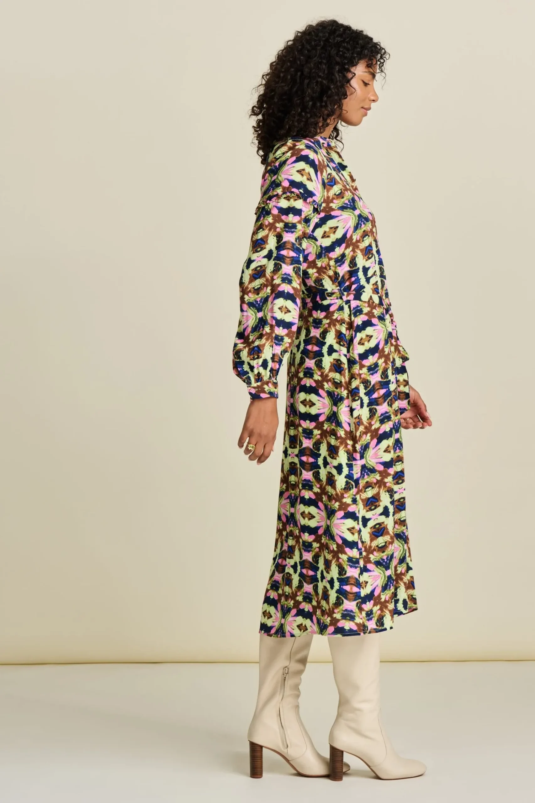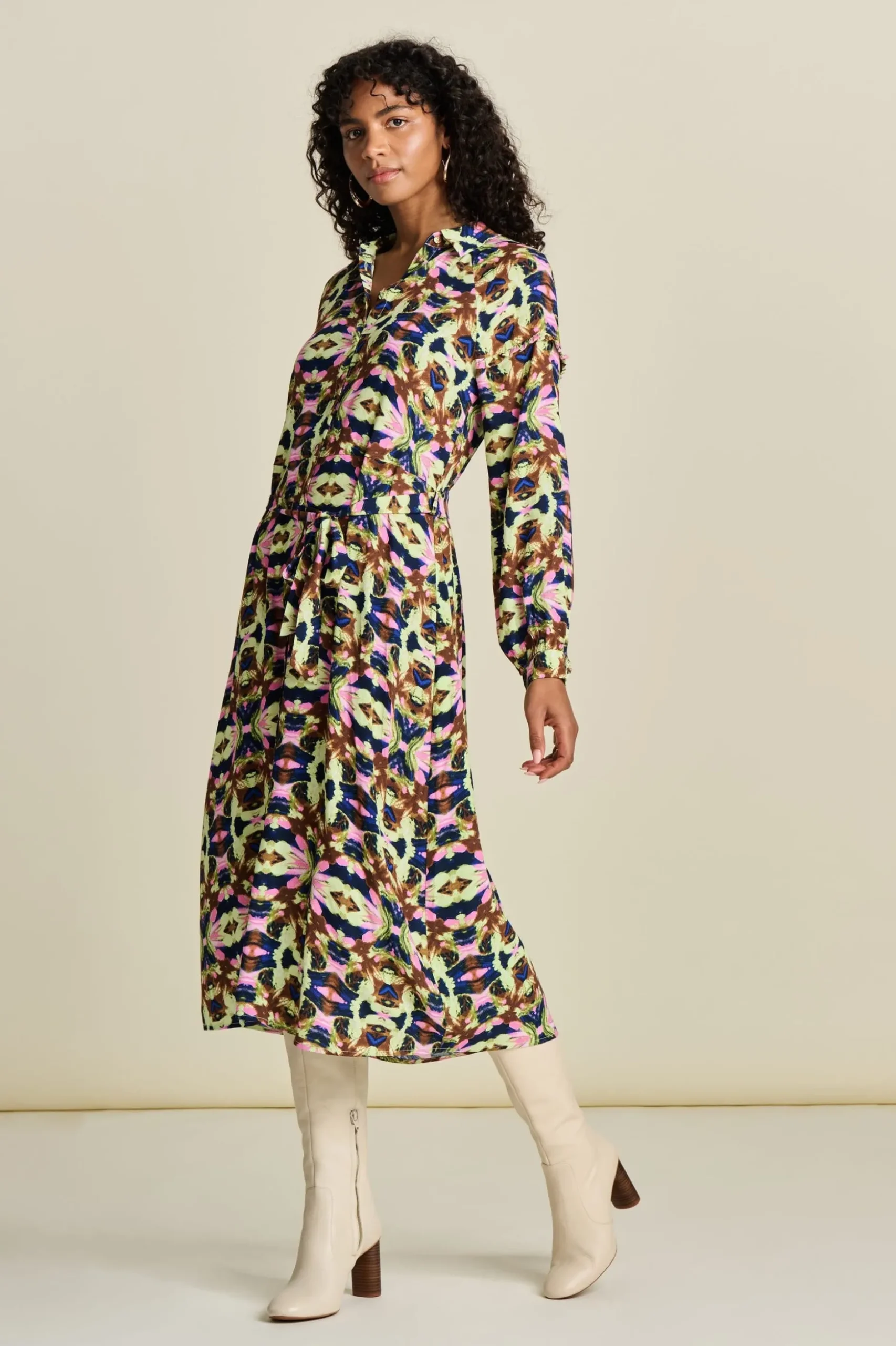 Pasvorm: Deze midi-jurk valt wijd tot op de kuit.